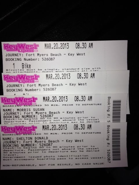 We made the ferry !!!! Bikes and all our stuff. It was touch and go for a while. We had heard the ferry company didn't want to take bikes with attached racks and panniers so were very concerned our trip would be modified before it even began. But we had no problems and everyone on board was extremely accommodating and friendly. While on board, we met a really nice couple (Jeff and Lynn) from Darbyshire England who let us share their booth. They are here visiting relatives on Pine Island and taking the ferry to spend a day in Key West. After hosing off the bikes with fresh water to take the salt off of them, we were ready to finally start at mile marker 0 on Highway 1.